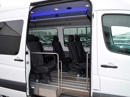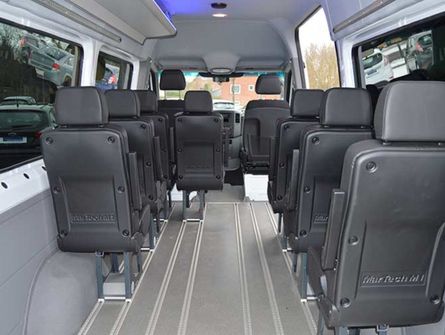 Vi råder over adskillige miljøvenlige Mercedes Sprinter minibusser med/uden lift, som er meget fleksible i indretningen. Vi kan flytte, reducere eller supplere sædeantal alt efter ønske til kapaciteten. Det er en stor fordel hvis der ønskes at vi befordrer én eller flere passagerer i kørestol, eller hvis I som kunde ønsker bussen indrettet med et par borde til den pågældende tur (mod merpris).