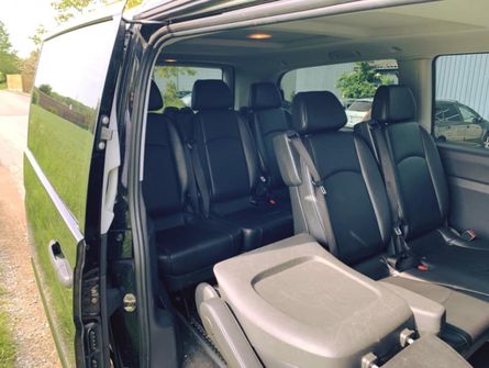 Vi har flere 9 pers. Mercedes Vito 116 med rigtig god bagageplads. De er udstyret med: